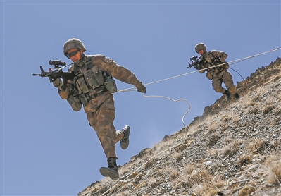 車隊疾馳30公里后,到達一片陌生地域?!鞍l(fā)現(xiàn)‘暴恐分子’,實施抓捕!”連長楊鵬賓一聲令下,各戰(zhàn)斗小組迅速投入戰(zhàn)斗。隊員們攀登滑降、隱蔽接敵,兵分多路實施圍剿,成功制服“暴恐分子”。