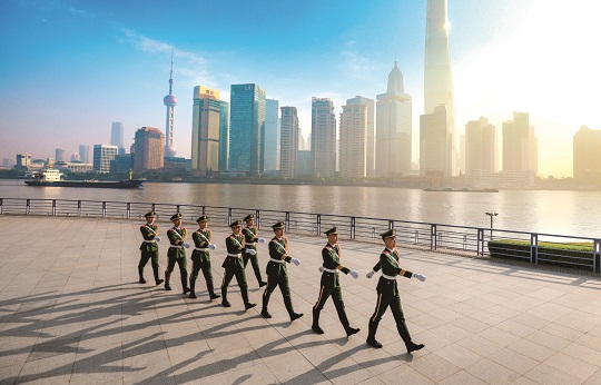 迎著晨光,武警上??傟?duì)執(zhí)勤第四支隊(duì)執(zhí)勤十中隊(duì)巡邏官兵走上戰(zhàn)位,一路經(jīng)過(guò)人民公園、人民廣場(chǎng),來(lái)到南京路。