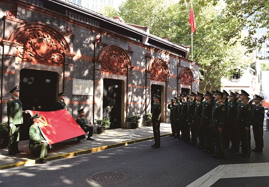 圖為武警上??傟?duì)執(zhí)勤第四支隊(duì)執(zhí)勤十中隊(duì)官兵在中共一大紀(jì)念館前重溫入黨誓詞。徐延鈞 攝