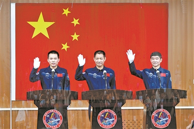 6月16日,神舟十二號載人飛行任務航天員聶海勝(中)、劉伯明(右)和湯洪波在酒泉衛(wèi)星發(fā)射中心與記者見面。本報記者 王衛(wèi)東攝