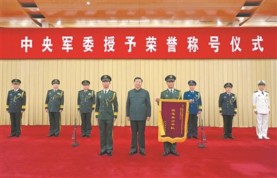 本報北京7月5日電 記者歐燦報道:中央軍委授予榮譽稱號儀式5日在京隆重舉行。中央軍委主席習近平向獲得榮譽稱號的單位頒授獎旗。