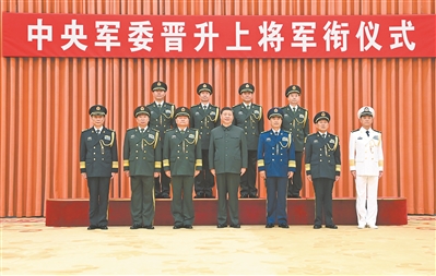 晉銜儀式在嘹亮的軍歌聲中結(jié)束。隨后,習(xí)近平等領(lǐng)導(dǎo)同志同晉升上將軍銜的軍官合影。