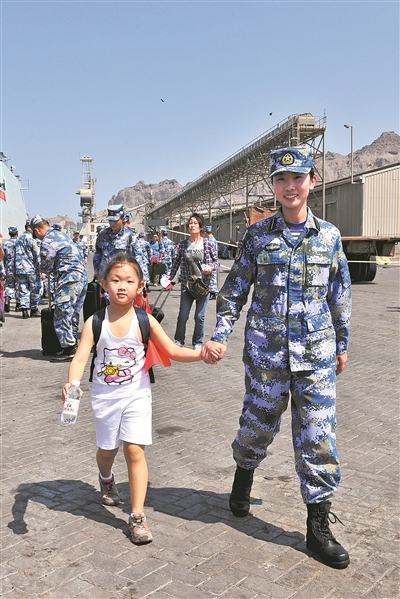 2015年也門撤僑行動中,郭燕手牽一個小朋友上艦回家。熊利兵 攝