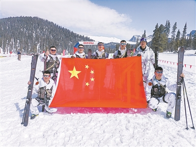 2021年4月,滕家?。ê笈庞胰﹨⒓印皣H軍事比賽-2021”雪地作戰(zhàn)行軍項目比賽時,與戰(zhàn)友合影。楊再新 攝