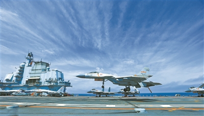 2018年4月12日,遼寧艦航母編隊參加南海大閱兵之后,隨即奔赴遠海,開展實兵對抗演練。圖為演練中殲-15艦載戰(zhàn)斗機放下尾鉤準(zhǔn)備著艦。本報記者 張雷 攝