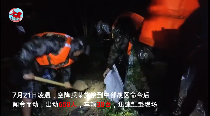 河南省開封市賈魯河祥符區(qū)段的兩處決口,情況危急。21日凌晨,空降兵某旅接到中部戰(zhàn)區(qū)命令,出動650人,車輛38臺,迅速趕赴現(xiàn)場,官兵們采用人工和機械相結(jié)合方式,筑起長1.5公里、高1.2米的沙袋墻,目前已完成大部分河堤加高任務(wù)。