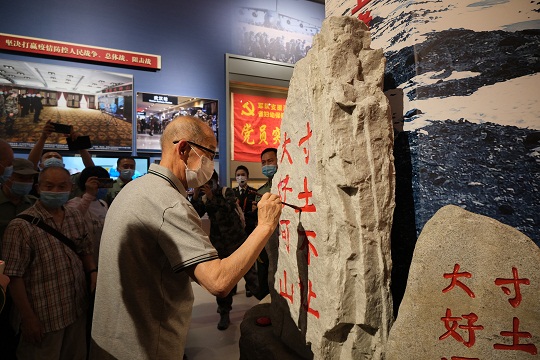 展柜里,有太多細(xì)節(jié)令人感動(dòng):王繼才去世當(dāng)日,在開山島升起的五星紅旗;新時(shí)代衛(wèi)國(guó)戍邊英雄群體的遺物,無(wú)聲地述說(shuō)著“大好河山、寸土不讓”的鏗鏘誓言;2020年年初,軍隊(duì)支援湖北醫(yī)療隊(duì)省婦幼保健院光谷院區(qū)“黨員突擊隊(duì)”旗上密密麻麻的簽名;火箭軍援鄂醫(yī)療隊(duì)員集體簽名的防護(hù)服,在展柜燈光的映襯下閃閃發(fā)亮……