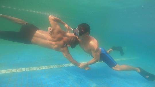 圖為“深?!表椖繀①愱爢T水下搏斗。于純浩 攝