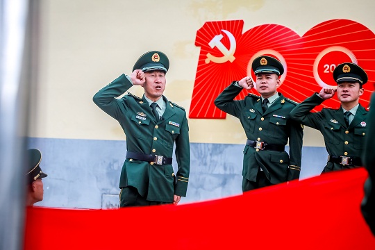 圖為慶祝建黨100周年時(shí)楊富祥(左一)向黨旗宣誓。楊浩 攝