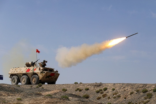 圖為中國參賽隊(duì)員在戰(zhàn)車上發(fā)射便攜式防空導(dǎo)彈。張嘉成 攝