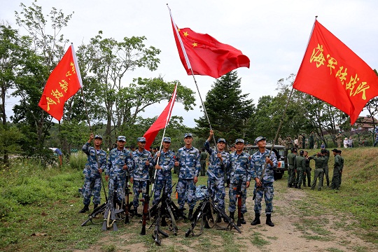 圖為中國(guó)參賽隊(duì)陸戰(zhàn)二班獲第三名后舉旗慶祝。肖勇利 攝