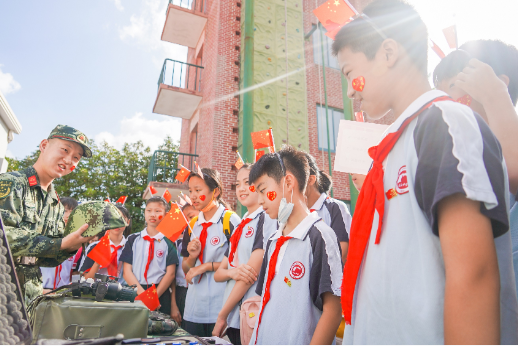 在營(yíng)區(qū)“靶場(chǎng)”,各式槍械裝備整齊地?cái)[在展示臺(tái)上。在教官帶領(lǐng)下,學(xué)生們很快掌握了武器使用基本原理和不同武器的使用效果和應(yīng)用場(chǎng)景。活動(dòng)最后,學(xué)生和官兵們揮舞著國(guó)旗,大聲齊唱《我和我的祖國(guó)》。