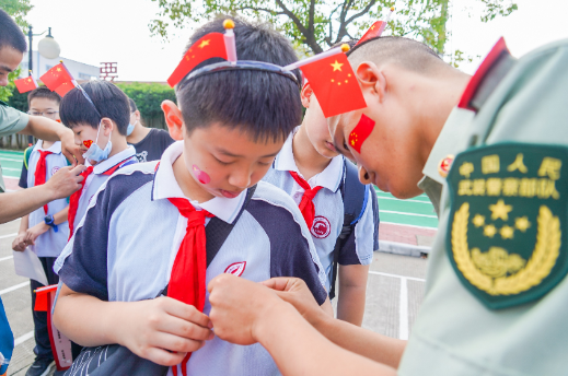 圖為武警戰(zhàn)士給學(xué)生貼上國(guó)旗貼紙,佩戴活動(dòng)胸標(biāo)。