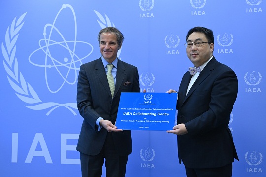 圖為國際原子能機(jī)構(gòu)總干事格羅西向中方代表授牌。國家原子能機(jī)構(gòu)供圖