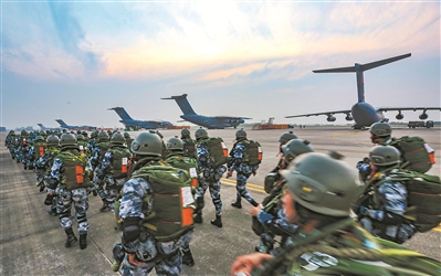 拂曉,某軍用機(jī)場(chǎng),數(shù)百名傘兵迅速完成傘具整理和武器裝備披掛,空降空投骨干對(duì)重型裝備和空投物資進(jìn)行裝載加固。通過(guò)3道檢查線后,傘兵們按照戰(zhàn)斗編組登上戰(zhàn)機(jī)。伴著震耳的轟鳴聲,多種機(jī)型運(yùn)輸機(jī)編隊(duì)依次升空,飛赴預(yù)定空域。