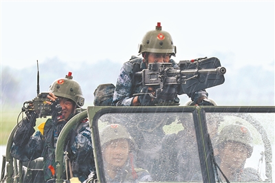 著陸后,官兵駕駛戰(zhàn)車(chē)冒雨疾馳。