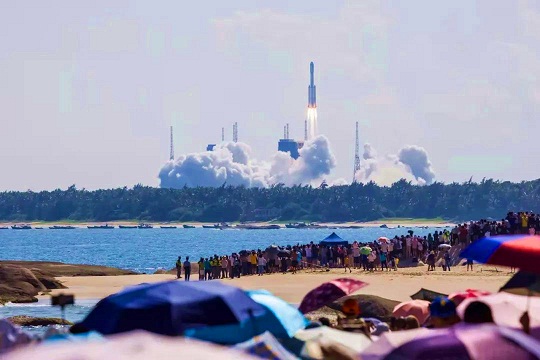 今年9月20日,海灘上、椰林旁、山頂上人山人海。伴隨著一陣山呼海嘯般的巨響,長征七號火箭托舉著天舟三號貨運飛船一飛沖天,中國空間站建設(shè)進入承上啟下的關(guān)鍵一步。人們揮舞著國旗、高唱愛國歌曲、眼含熱淚,目送“天舟”奔赴太空。那個下午,騰飛的火箭與碧海藍天,歡呼的人群與紅色旋律,構(gòu)成了一幅中華民族探索浩瀚宇宙的壯美畫卷。