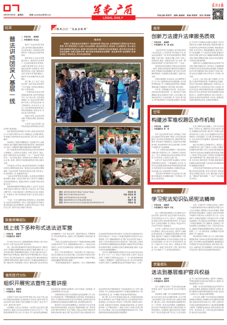 這是今年“憲法宣傳周”活動(dòng)期間,空軍涉軍維權(quán)跨區(qū)協(xié)作的一個(gè)典型案例。近年來(lái),空軍官兵法律服務(wù)需求和涉軍維權(quán)案件逐年增多,特別是很多官兵異地服役,僅靠組織發(fā)函、電話溝通、派人出面效果并不理想。