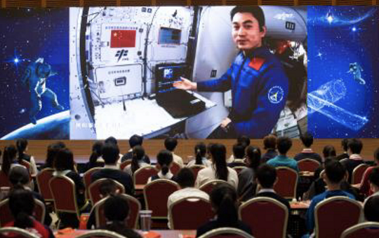 在約60分鐘的授課中,神舟十三號(hào)飛行乘組航天員翟志剛、王亞平、葉光富生動(dòng)介紹展示了空間站工作生活場(chǎng)景,演示了微重力環(huán)境下細(xì)胞學(xué)實(shí)驗(yàn)、人體運(yùn)動(dòng)、液體表面張力等神奇現(xiàn)象,并講解了實(shí)驗(yàn)背后的科學(xué)原理。授課期間,航天員通過(guò)視頻通話(huà)形式與地面課堂師生進(jìn)行了實(shí)時(shí)互動(dòng)交流。