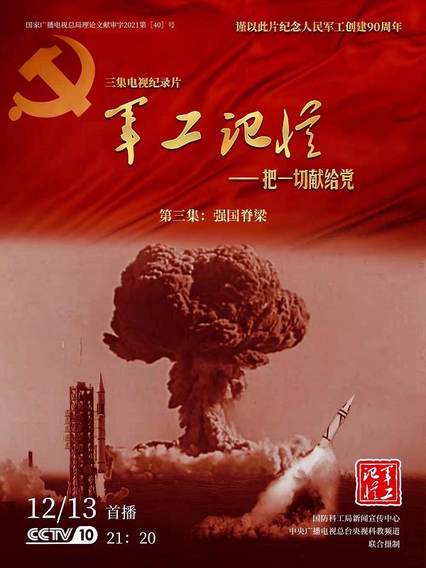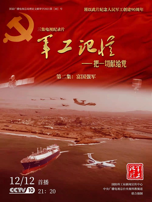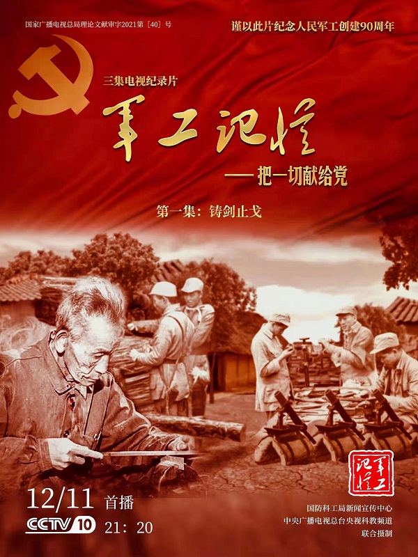 為慶祝中國共產(chǎn)黨成立100周年,紀(jì)念黨領(lǐng)導(dǎo)下的人民軍工創(chuàng)建90周年,由國防科工局指導(dǎo),國防科工局新聞宣傳中心聯(lián)合中央廣播電視總臺社教節(jié)目中心攝制,各軍工集團(tuán)大力支持的3集重大理論文獻(xiàn)電視紀(jì)錄片《軍工記憶——把一切獻(xiàn)給黨》,將于12月11日21:20在央視科教頻道(CCTV-10)《探索發(fā)現(xiàn)》欄目首播,連續(xù)播出3天。該紀(jì)錄片旨在向建黨百年獻(xiàn)禮,向人民軍工90周年致敬,向全社會弘揚軍工精神傳遞軍工文化,激勵國防科技工業(yè)戰(zhàn)線廣大干部職工不忘初心、接續(xù)奮斗,為實現(xiàn)強軍強國夢想貢獻(xiàn)力量。