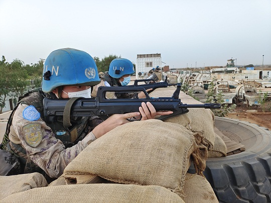 春節(jié)期間,中國第九批赴馬里維和工兵分隊組織了戰(zhàn)備演練。圖為營區(qū)警報響后,快反組迅速領取武器彈藥,占領預定位置,進入嚴密戒備狀態(tài)。王宏陽 攝
