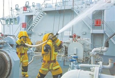 編隊(duì)航行途中,考核組下達(dá)“敵”情通報(bào):“發(fā)現(xiàn)快速移動(dòng)目標(biāo)來(lái)襲!”聞令而動(dòng),參訓(xùn)官兵迅速識(shí)別目標(biāo)并做好防御準(zhǔn)備?!皺C(jī)艙破損進(jìn)水”“補(bǔ)給站起火”……戰(zhàn)斗打響后,各種險(xiǎn)情接踵而至。堵漏、滅火、搶修、排除故障,官兵們沉著應(yīng)對(duì),及時(shí)化解了一個(gè)個(gè)險(xiǎn)情。