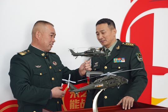 圖為汪曉紅(右)向一級軍士長喬壽和了解不同型號直升機性能差異。張永進 攝