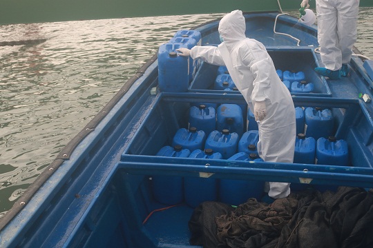 3月13日晚,廣東湛江海警局根據(jù)線報(bào)指引,在雷州市大唐電廠附近海域查獲一艘“大飛”快艇,艇上載有大量空汽油桶,隨艇未找到任何船舶證書及貨物單據(jù)。