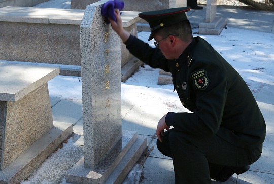 圖為烏魯木齊軍事檢察院檢察官認(rèn)真擦拭墓碑塵土。彭建 攝