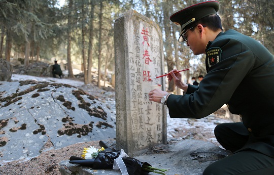 圖為烏魯木齊軍事檢察院檢察官為英烈墓碑描紅碑文。彭建 攝