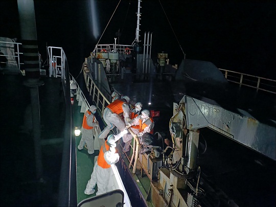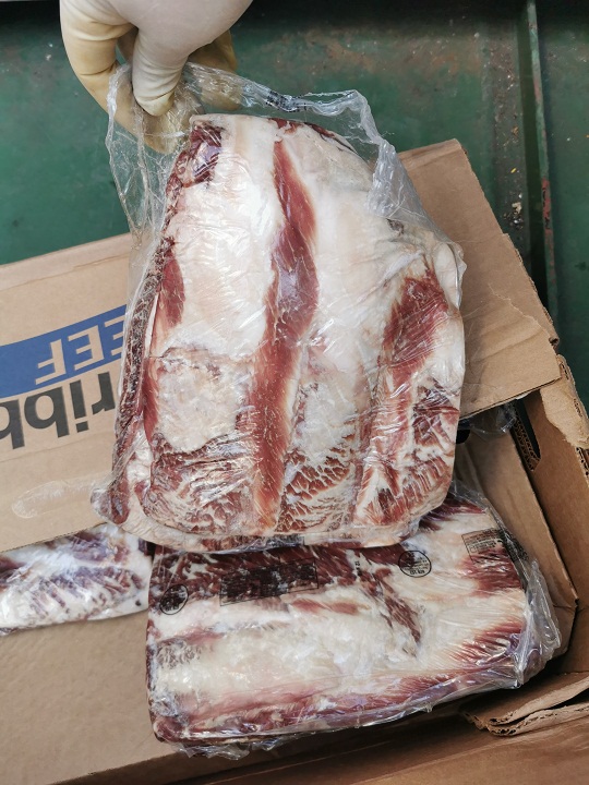 3月30日,涉案走私團伙準備在山東威海海域?qū)嵤┳咚椒缸锘顒?。得知線索后,山東海警局立即派遣威海海警局執(zhí)法艦艇前往目標海域開展查緝。在執(zhí)法艦艇發(fā)現(xiàn)嫌疑船舶并靠近過程中,該走私船舶突然加速意欲逃離,海警執(zhí)法員果斷將其逼停,并組織船舶登檢。經(jīng)查,該船于3月23日自韓國裝載無合法來源和未經(jīng)檢驗檢疫的日本進口和牛肉后,關(guān)閉AIS設(shè)備進入威海海域,被山東海警局當(dāng)場查獲。