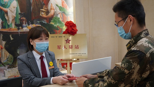 “來(lái)到‘軍人驛站’,看到房間內(nèi)干凈整潔的床上用品,一應(yīng)俱全的配套設(shè)施,充滿濃厚軍旅元素的物品飾件,還有熱情周到的服務(wù),我感覺(jué)就像住進(jìn)家里一樣溫馨。”近日,武警機(jī)動(dòng)某支隊(duì)現(xiàn)役警官蔣晨入住江蘇省無(wú)錫市某酒店“軍人驛站”后,談及他的感受。