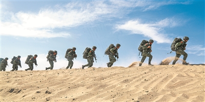 圖為該中隊官兵在沙漠腹地開展奔襲訓練。王國銀 攝