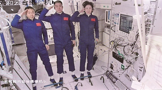 圖為6月5日進駐天和核心艙的航天員陳冬(中)、劉洋(右)和蔡旭哲向全國人民敬禮的畫面。新華社記者李鑫 攝