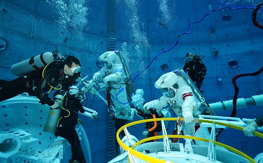 圖為劉洋和蔡旭哲進行空間站任務水下訓練??追街?攝