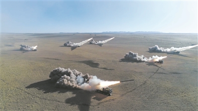 圖②:第82集團軍某旅深入草原腹地參加聯(lián)合演練,探索和檢驗深化陸空協(xié)同的訓法戰(zhàn)法。圖為火箭彈出膛瞬間。耿露 攝