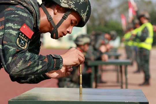 圖為參賽隊員疊放彈殼鍛煉心理抗壓能力。雷轍 攝