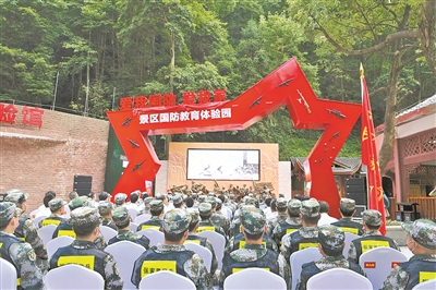 筆者走下景區(qū)“強軍號”小火車,一座紅色五角星形狀的“國防門”便映入眼簾,門上“愛我國防愛我家”7個大字引人注目。門內(nèi)的國防教育體驗園,是景區(qū)里一處別樣的風景,也是近期熱度飆升的新晉熱門“打卡地”。據(jù)統(tǒng)計,85%的游客主動進園體驗。