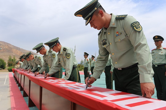 武警青??傟牂C(jī)動二支隊演訓(xùn)場上,官兵們跨彈坑、攀云梯、翻高墻……突然一聲哨響:全體集合!大家集體重溫入黨誓詞。之后,官兵在寫有“永遠(yuǎn)聽黨話,堅定跟黨走,喜迎二十大,奮進(jìn)新征程”的橫幅上寫下自己的名字。