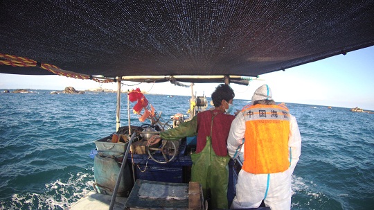 圖為執(zhí)法員立即聯(lián)系當?shù)貪O民利用“小舢板”一同進行協(xié)助救援。
