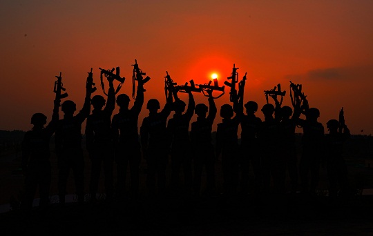 圖為夕陽西下,官兵結(jié)束了一天的訓練。