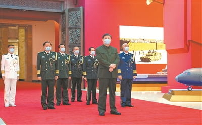 下午4時30分許,習近平來到中國人民革命軍事博物館,步入展廳參觀展覽。展覽聚焦以習近平同志為核心的黨中央領導國防和軍隊建設的偉大實踐,安排8個單元展區(qū),設置“黨在新時代的強軍目標”、“重整行裝再出發(fā)”、“礪劍鑄盾 奔向一流”、“大好河山 寸土不讓”、“愛我人民愛我軍”、“深情勵三軍 奮進新征程”等重點展項,通過1400余件文物實物、630余張照片、近百套武器裝備模型以及大量圖表、視頻、藝術作品、互動項目等,生動展示了新時代國防和軍隊建設的壯闊歷程和偉大成就,充分展現(xiàn)了人民軍隊忠誠維護核心、矢志奮斗強軍的昂揚風貌。習近平不時駐足觀看,認真聽取講解,詢問有關情況。