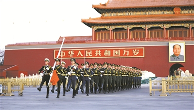 圖為中國人民解放軍儀仗大隊國旗護衛(wèi)隊執(zhí)行升旗任務。隋曉 攝