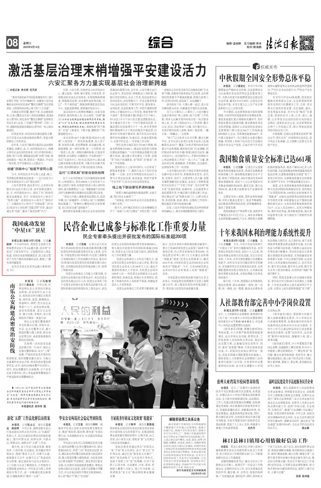 本報文昌(海南)9月13日電 記者廉穎婷 通訊員喻鵬 王茄歡 黃國暢 北京時間2022年9月13日21時18分,我國在文昌航天發(fā)射場使用長征七號改運載火箭,成功將“中星1E”衛(wèi)星發(fā)射升空。衛(wèi)星順利進入預定軌道,發(fā)射任務獲得圓滿成功。該衛(wèi)星主要用于為用戶提供高質量的話音、數據、廣播電視傳輸服務。
