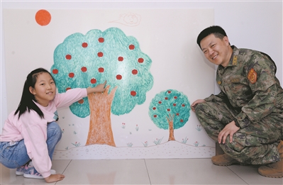 在張威偉家的墻上,畫著一棵蘋果樹。不知從哪天起,蘋果樹旁又“長”出一棵小蘋果樹。女兒說,爸爸表現(xiàn)好,她就用紅紙剪一個蘋果貼在上面;表現(xiàn)不好,蘋果樹上就會長出藍(lán)色的蘋果。