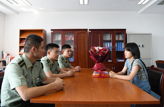 啟程前,武警合肥支隊邀請萬鴻玥和她的母親來到部隊,看一看父親曾經(jīng)奮斗的軍營,聽一聽父親的英勇事跡。