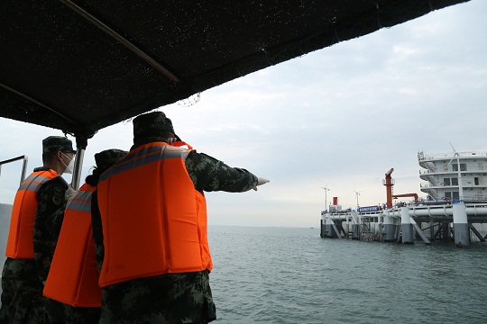 圖為山東海警局執(zhí)法員檢查涉海平臺(tái)建設(shè)情況。盧煜萱 攝