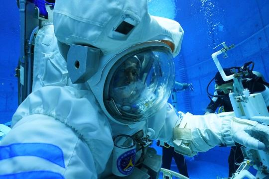 在圓形的模擬失重水槽中,航天員穿著數(shù)百公斤的水下服懸浮在藍色深水中。水下訓(xùn)練服相當(dāng)于一個“人”形飛船,是個鋼性結(jié)構(gòu),張陸的肩比較寬,每次把自己的兩只胳膊塞進服裝里或者出服裝,都要費盡九牛二虎之力。在水里一待就是五六個小時,整個人的四肢被固定在水下服里,癢了痛了都只能咬牙堅持,餓了渴了只能喝水。