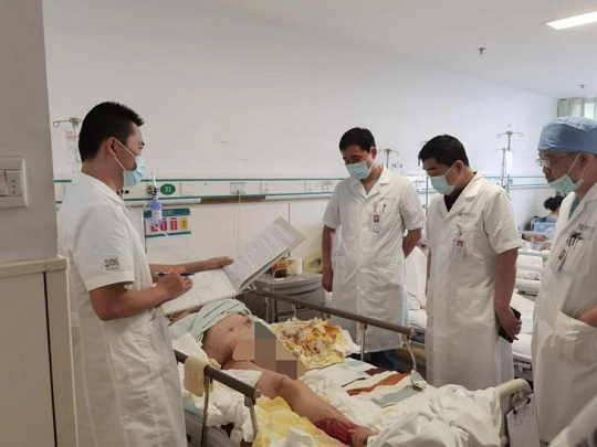 患者緊急入住燒傷科三病區(qū)后,通過仔細(xì)檢查,發(fā)現(xiàn)患者情況非常危重:全身多發(fā)骨折伴膿毒血癥,持續(xù)高熱,而且胸腹部由于大量皮膚軟組織缺損,創(chuàng)面幾乎緊挨胸膜和腹膜,稍有不慎就會進入胸腔和腹腔導(dǎo)致感染擴散。面對命懸一線的患者,學(xué)部創(chuàng)面修復(fù)團隊迎難而上,燒傷整形醫(yī)學(xué)部申傳安主任第一時間床旁查看患者并且組織全科討論,制定了穩(wěn)定生命體征、適度保守清創(chuàng)和逐步封閉創(chuàng)面的總體治療方案。