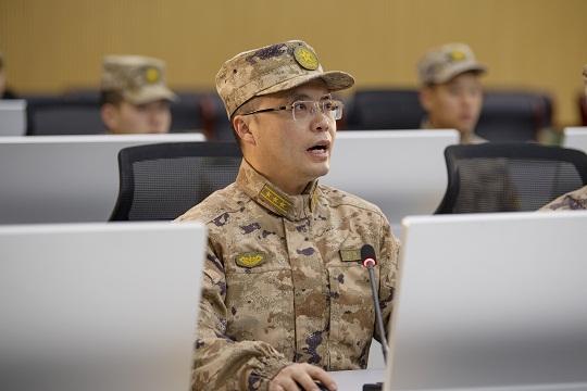 圖為丁國林正在組織對(duì)抗訓(xùn)練導(dǎo)調(diào)作業(yè)。